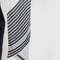 Ascend is a bias wrap with bold stripes of color. Two versions are provided: the first version is knit on the bias with an I-Cord edging, the second is knit on the bias with no edge treatment. The second version is appropriate for Koan which, once blocked, will not curl along the edge.